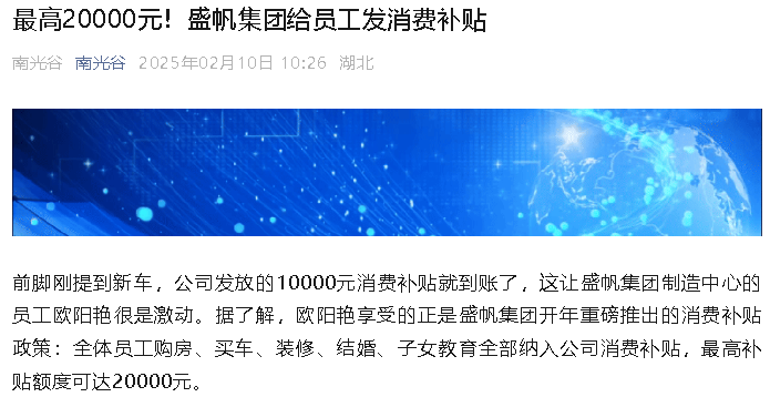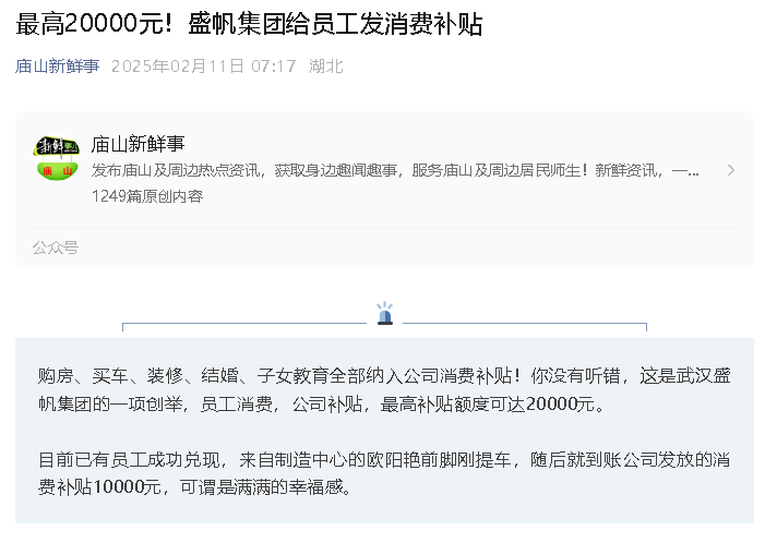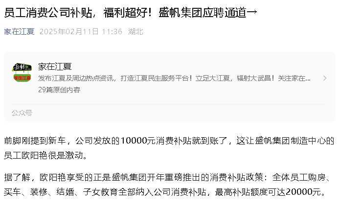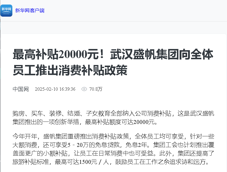購(gòu)房、買車、裝修、結(jié)婚、子女教育全部納入公司消費(fèi)補(bǔ)貼,這是武漢盛帆集團(tuán)推出的一項(xiàng)創(chuàng)新舉措,最高補(bǔ)貼額度可達(dá)20000元···